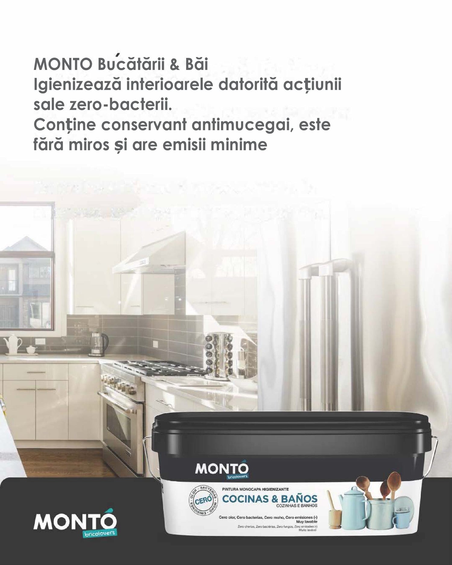 Vopsea IGIENIZANTA ANTIMUCEGAI – specială pentru bucătării, băi, locuinte, beton, zidarie, ciment, caramida, inodora, pe bază de apă, interior/exterior Monto, 2,5L